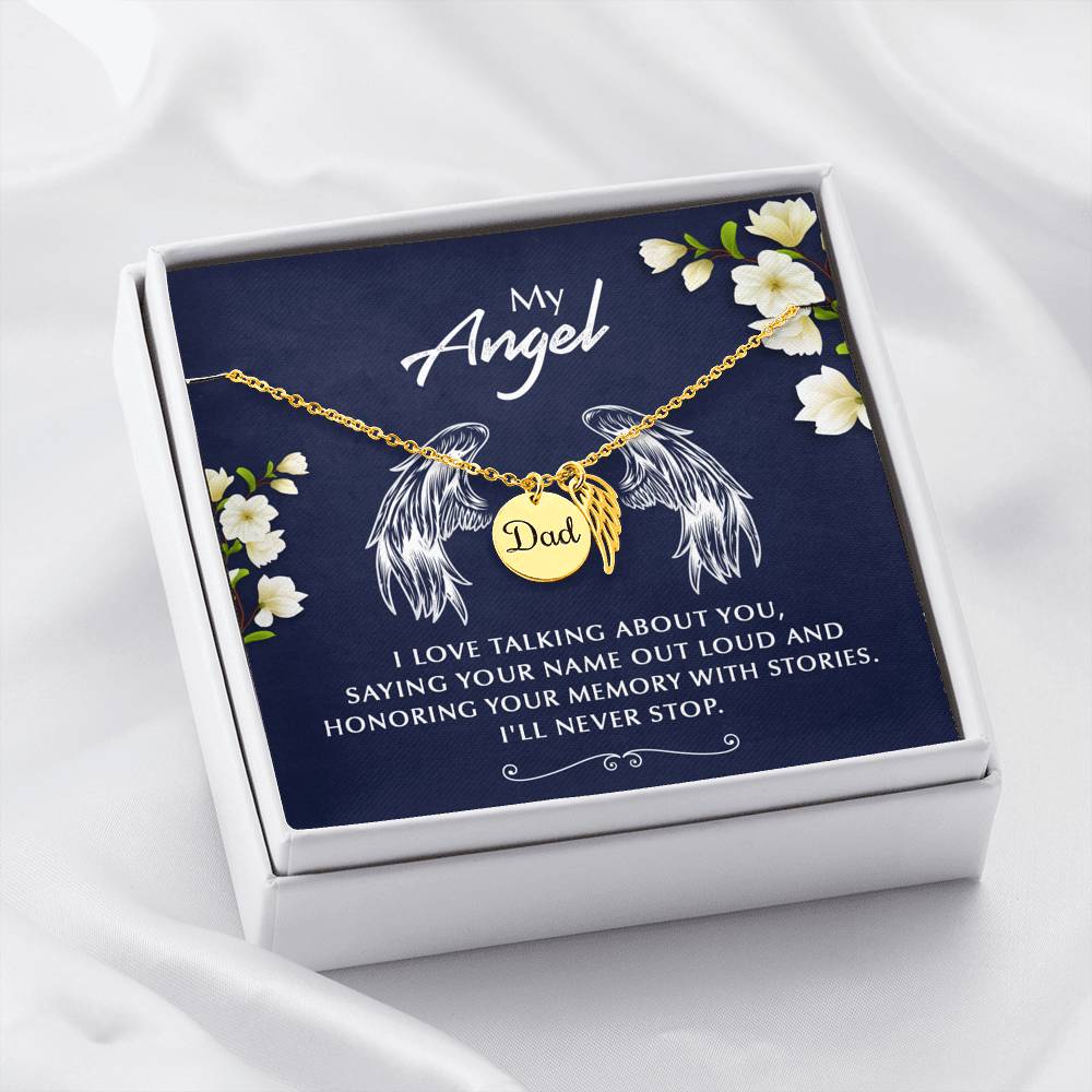Keep Dad close to your heart with this loving Remembrance Necklace. "Dad" is engraved on the dainty hand polished coin and enhanced in black enamel, paired with a delicate polished Angel Wing tag on an adjustable cable chain measuring 18"-22" with a lobster clasp closure. Available in Polished Stainless Steel and 18k Yellow Gold over Stainless Steel. Pendant Dimensions: Circle: 0.5" (13mm), Wing: 0.625" (10mm)