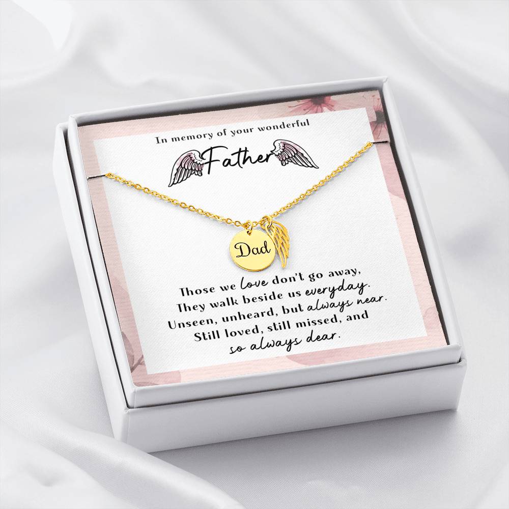 Keep Dad close to your heart with this loving Remembrance Necklace. "Dad" is engraved on the dainty hand polished coin and enhanced in black enamel, paired with a delicate polished Angel Wing tag on an adjustable cable chain measuring 18"-22" with a lobster clasp closure. Available in Polished Stainless Steel and 18k Yellow Gold over Stainless Steel. Pendant Dimensions: Circle: 0.5" (13mm), Wing: 0.625" (10mm)